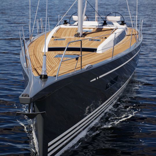 Le X46 MkII adopte l'étrave S bow, déjà vue sur les modèles Pure X plus récents. Ce dessin modifie la silhouette du bateau mais répond aussi à une contrainte pratique. Il permet l'installation d'ancres de plus grande taille sans perturber le plan de pont ni multiplier les appendices.