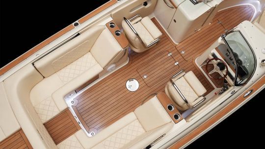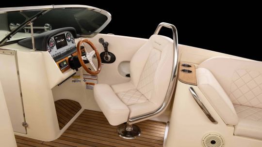 Le plan de pont adopte une configuration bowrider. À l'avant, un espace en U accueille les passagers avec banquettes et coussins. Le cockpit central comprend deux sièges baquets au poste de pilotage et à bâbord. Les dossiers sont élargis et intègrent un point d'appui en inox.