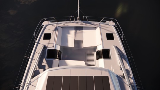 ... cockpit avant par des escaliers intégrés. Cette circulation longitudinale facilite les déplacements en mer et lors des manœuvres. À l'avant, un cockpit fixe est aménagé en zone de détente, avec assises et bains de soleil.