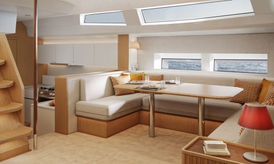 La cuisine est ouverte sur le salon, favorisant une vie à bord conviviale. Cette implantation distingue le 68 du 78, dont l'organisation prévoit un espace équipage séparé avec cuisine dédiée.