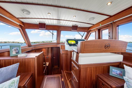 Le cockpit concentre une grande banquette en L, des coffres de rangement, un réfrigérateur et un barbecue. Ce type d'aménagement vise clairement les escales et les mouillages forains. La plateforme arrière hydraulique facilite la mise à l'eau d'une annexe ou l'accès à la baignade.
