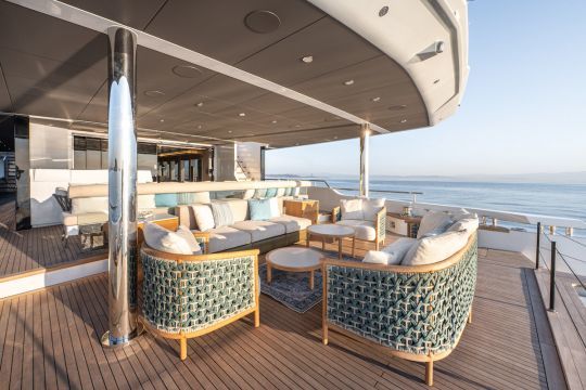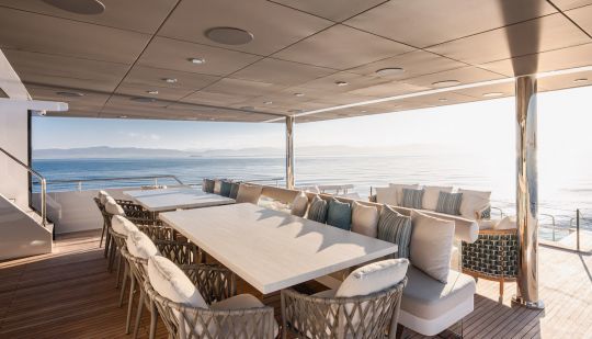 Ce dispositif fluidifie les circulations. Concrètement, l'équipage peut servir à table pendant que d'autres passagers utilisent la piscine ou accèdent à l'eau. Et cette continuité entre intérieur et extérieur réduit les ruptures d'usage.