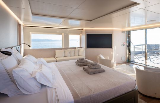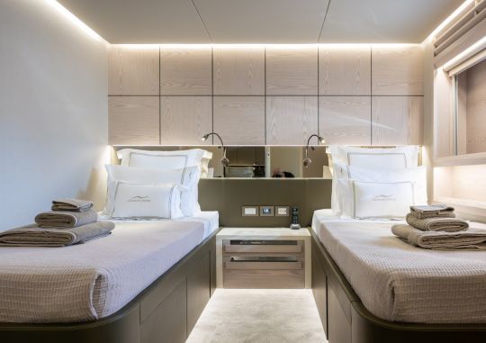 Le plan intérieur propose six cabines pour douze passagers, avec une suite propriétaire de plain pied sur le pont principal. Deux cabines offrent une modularité intéressante. Elles peuvent servir de chambre enfant, de bureau ou de cabine supplémentaire.