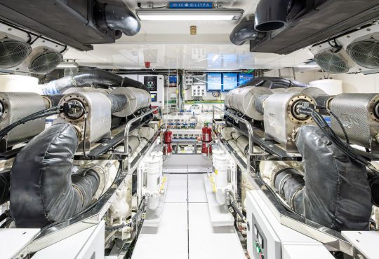 La propulsion repose sur deux moteurs MAN de 800 chevaux, avec une option à 900 chevaux. Ce choix reste classique pour un yacht de ce tonnage. Il privilégie la fiabilité et la consommation maîtrisée à vitesse modérée.