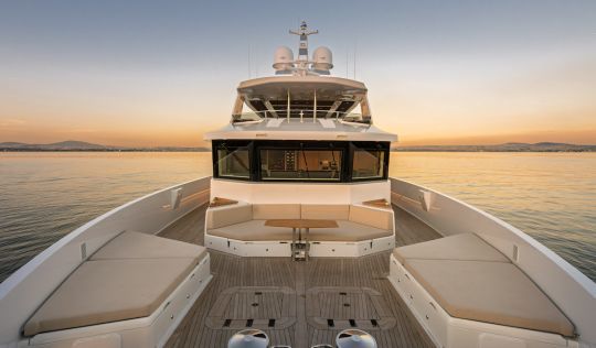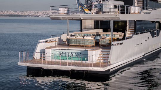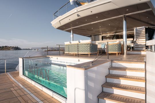 La poupe concentre une grande partie du concept. Trois niveaux s'enchaînent depuis le cockpit jusqu'à la plateforme de bain. On passe d'un espace repas à une zone lounge intégrant une piscine, puis à un accès direct à la mer.