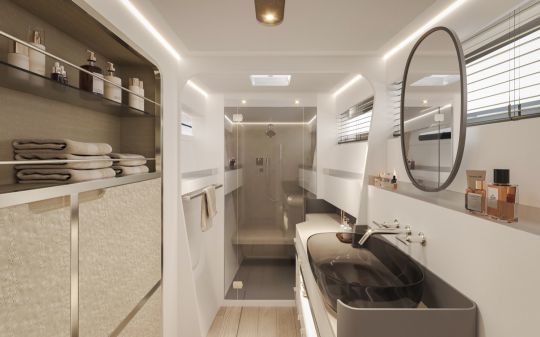 La répartition des cabines distingue clairement les usages. La coque bâbord accueille une suite propriétaire positionnée à l'avant, complétée par une cabine arrière pouvant recevoir des invités ou un équipage. À tribord, une cabine double arrière dispose d'un espace salon privatif, tandis qu'une autre cabine double est installée à l'avant.