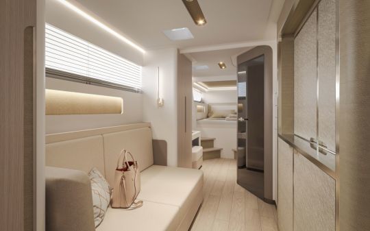 ... les niveaux, y compris à l'intérieur. Le mobilier est lui aussi réalisé en carbone, ce qui permet de contenir le déplacement global malgré les volumes d'un 74 pieds.