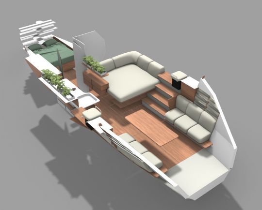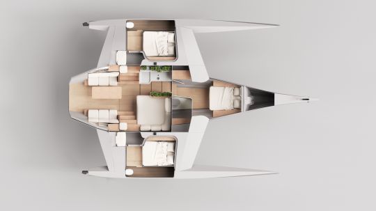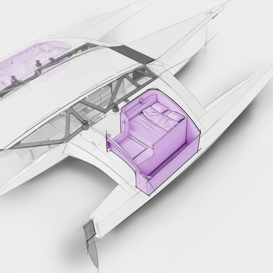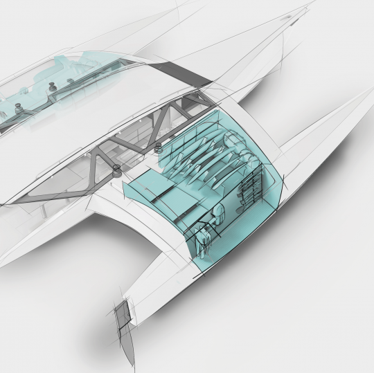 L'intérieur du trimaran suit la même philosophie. Les bras de liaison deviennent des volumes exploitables, capables d'accueillir des modules variés.