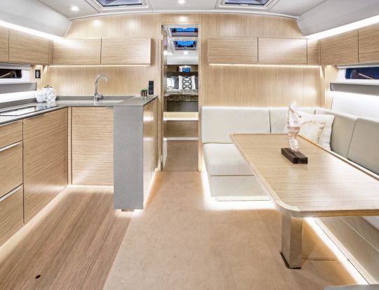 L'électronique de navigation B&G fait aussi partie de la configuration de série, avec traceur, afficheurs, VHF avec AIS et pilote automatique commandable à distance. Le moteur de puissance supérieure, normalement facturé en option, est inclus lui aussi. À bord, la dotation comprend encore des taquets inox, défenses, amarres, une grande table de cockpit, des mains courantes inox, des liseuses avec prises USB, des moustiquaires, ainsi que du teck sur les assises et le plancher de cockpit.