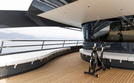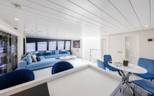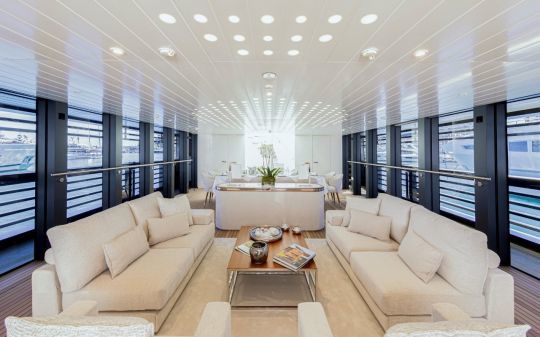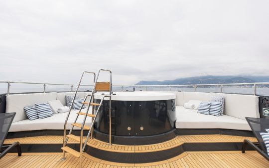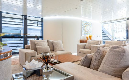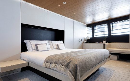 Le yacht peut accueillir jusqu'à 12 invités dans cinq cabines, avec notamment une suite armateur sur toute la largeur, dotée de deux terrasses privatives.