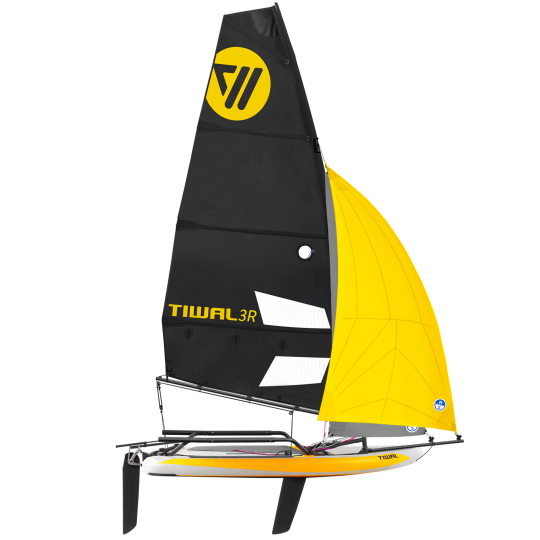 Le Tiwal 3R Max introduit un gréement plus complet avec l'ajout d'un foc de 2 m² et d'un gennaker de 3 m², en complément d'une grand-voile de 6,2 à 7,2 m² fournie par North Sails. Cette configuration modifie sensiblement le comportement du bateau. Au près, le foc améliore la remontée au vent et participe à l'équilibre longitudinal. Aux allures portantes, le gennaker favorise le départ au planning et permet de maintenir des vitesses plus élevées dans les risées.