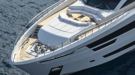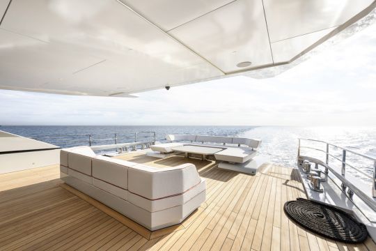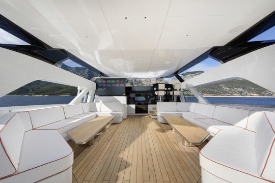 Le sundeck, d'une surface de plus de 50 m², concentre plusieurs fonctions : zone ombragée sous hard-top, espaces de bain de soleil et jacuzzi. Un bar et un écran escamotable permettent de basculer vers une utilisation en soirée. Deux sièges de pilotage y sont également intégrés, offrant une position avancée en navigation.