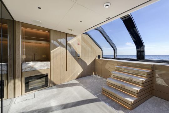 Au niveau de l'eau, le beach club s'organise autour d'une plateforme en teck et d'un système hydraulique facilitant la mise à l'eau des annexes et des équipements nautiques. Une salle de sport prend place derrière la plage arrière, en lien direct avec l'extérieur.