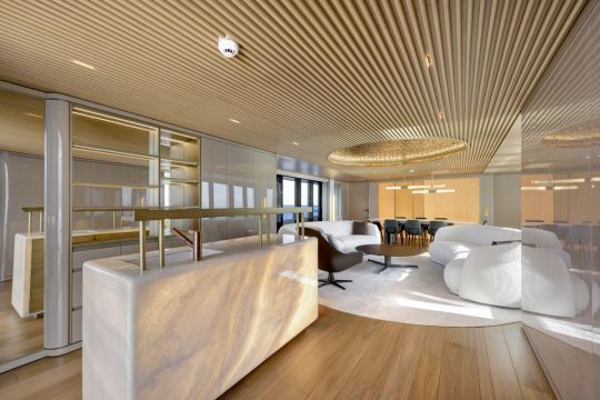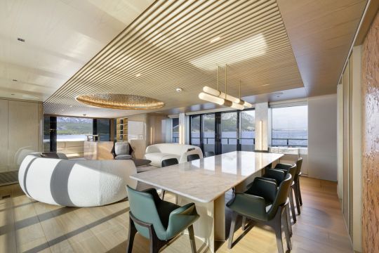 L'aménagement intérieur, réalisé par Yodezeen avec les équipes du chantier, s'appuie sur une esthétique de type loft. L'onyx ivoire est utilisé à la fois pour le bar et la table de salle à manger, tandis que le parquet en chêne fait écho aux ponts extérieurs en teck.