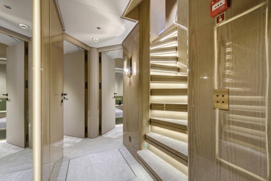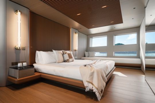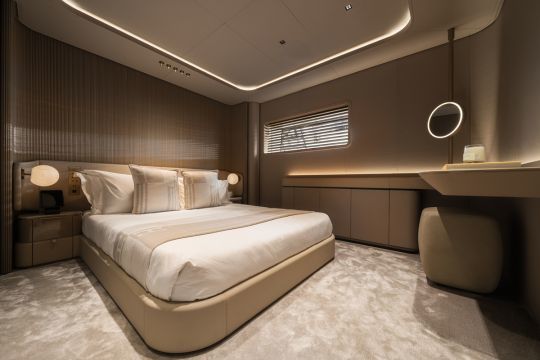 La suite propriétaire, située à l'avant du pont principal, dépasse 50 m². Elle comprend deux salles de bain reliées par une douche centrale et un dressing pleine largeur. Les cabines invités reprennent les mêmes codes, avec des variations de matériaux comme le travertin ou le marbre.