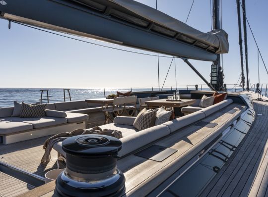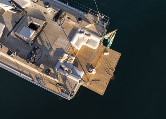 Cet espace peut accueillir différents usages au mouillage, avec des assises intégrées et un accès direct à la mer. La continuité avec le cockpit principal renforce la circulation à bord.