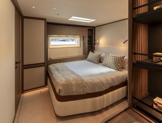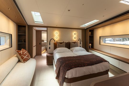 L'aménagement intérieur comprend quatre cabines. La suite propriétaire est positionnée à l'avant. Une cabine invités se situe en amont du carré, et deux cabines arrière sont configurées en version modulable.