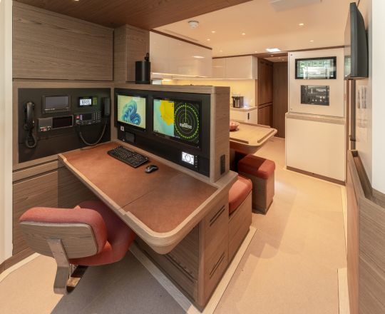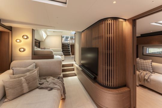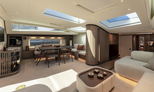 Chaque cabine dispose de sa salle d'eau. Le carré central regroupe un espace salon et une zone repas en plan ouvert. À tribord, un espace dédié au divertissement complète l'ensemble.