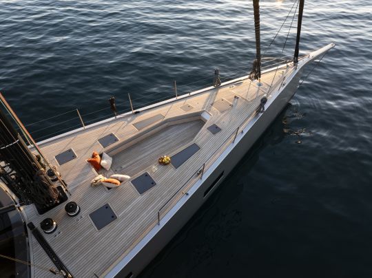 Le pont adopte une configuration flush deck avec un rouf bas. Cette architecture dégage les passavants et facilite les déplacements entre les postes de manœuvre et le cockpit.